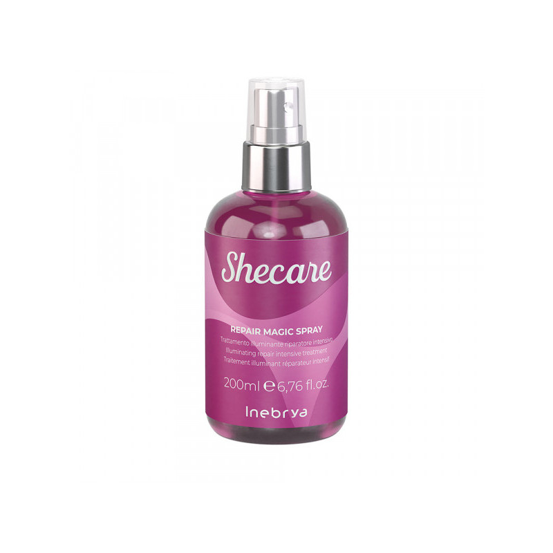 Le Spray Magic SheCare Inebrya est un soin sans rinçage idéal pour illuminer et réparer les cheveux abîmés et traités.
